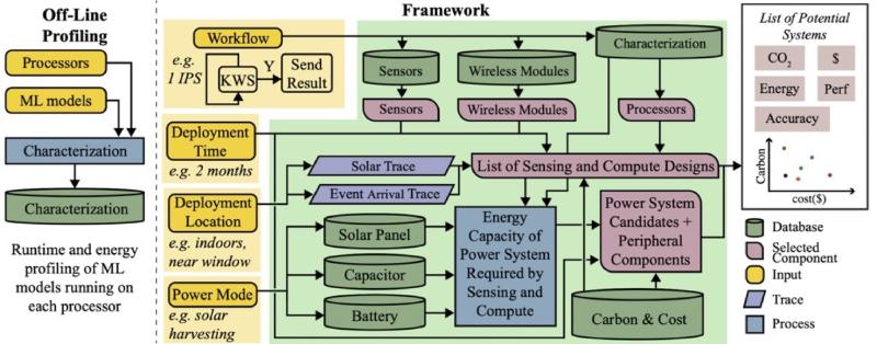 The framework integrates processor and ML profiling, sensing and wireless modules, and alternative power architectures such as solar panels, capacitors, and batteries. It incorporates deployment-specific factors — including location, energy availability, and expected lifetime — to evaluate candidate configurations across carbon footprint, cost, and system capability. By explicitly modeling embodied and operational emissions across the stack, this approach enables designers to move beyond generic, over-provisioned hardware and instead select system configurations aligned with environmental goals and real-world constraints.